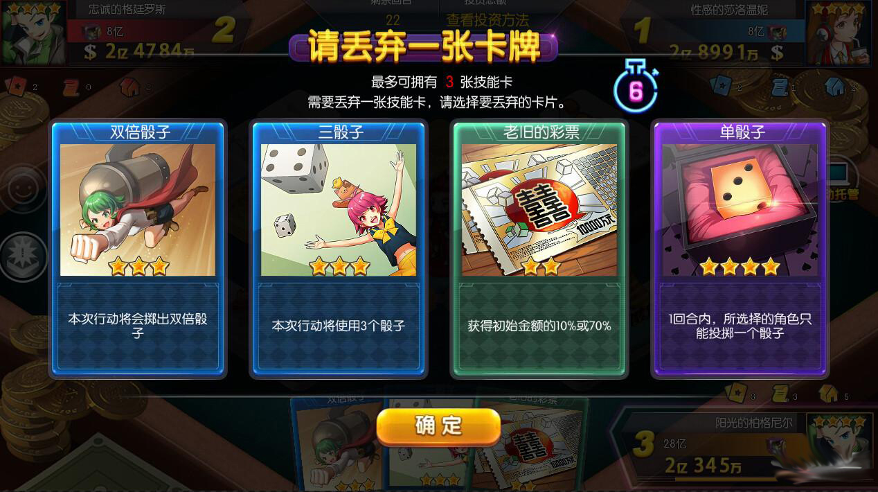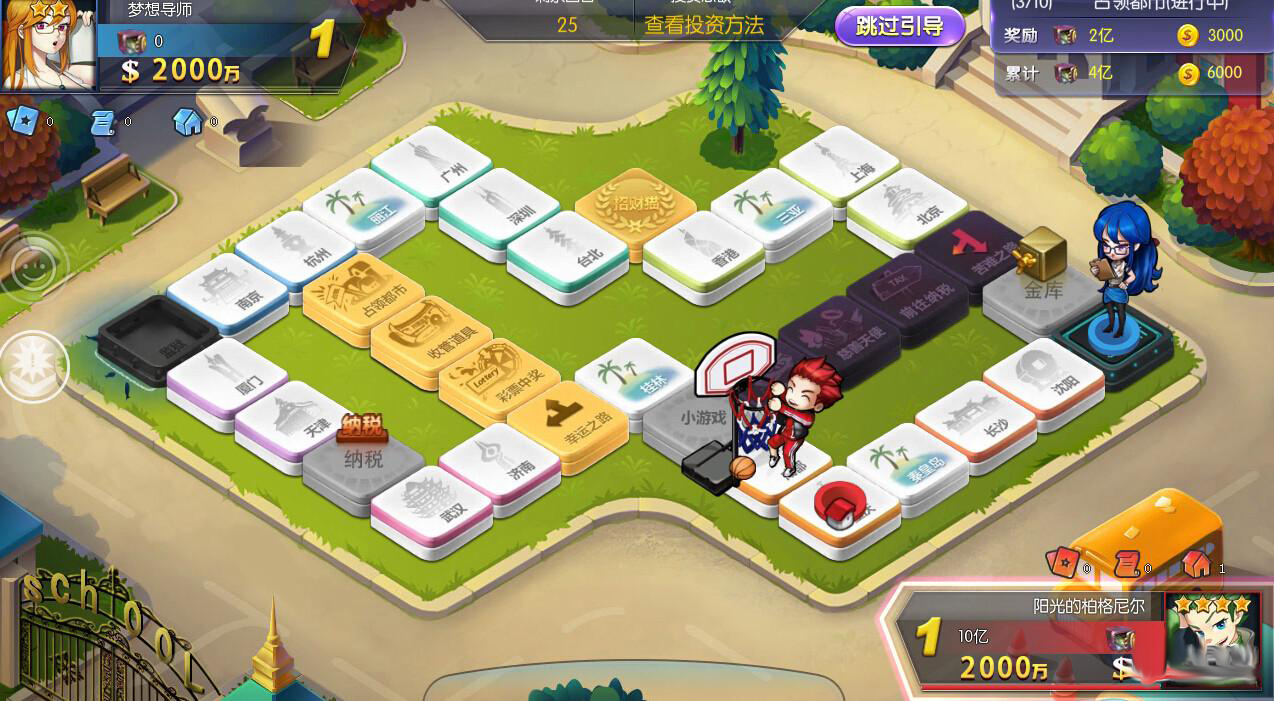 这款《梦想大富翁》总体而言还是和小编以前玩的大富翁棋有点区别的,不过操作方式还是没有变。我们玩家通过投骰子获得点数,然后操作战棋上的人物进行移动获得随机事件。而这款《梦想大富翁》把随机事件更多的设定成经营类为主,只要把对方的钱全部获得则获得胜利。